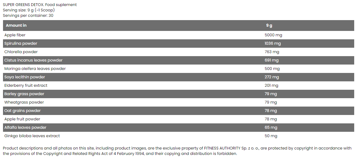 FA SUPER GREENS Detox е додаток во исхраната во форма на лесно растворлив прашок, за детоксикација и чистење на телото. Универзалната формула овозможува подеднакво да ја користат жените и мажите. Формулата е добро осмислен состав од растителни екстракти заедно со овошје и зеленчук во прав и додадени влакна. Додатокот содржи само природни компоненти, без додадени бои и шеќер и може успешно да го користат вегани и вегетаријанци.