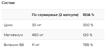 Состав: магнезиум оксид, капсула (говедски желатин; боја: Candurin Silver Fine, Brilliant црна, црн железен оксид), цинк сулфат монохидрат, средство за полнење (микрокристална целулоза), пиридоксин хидрохлорид.
